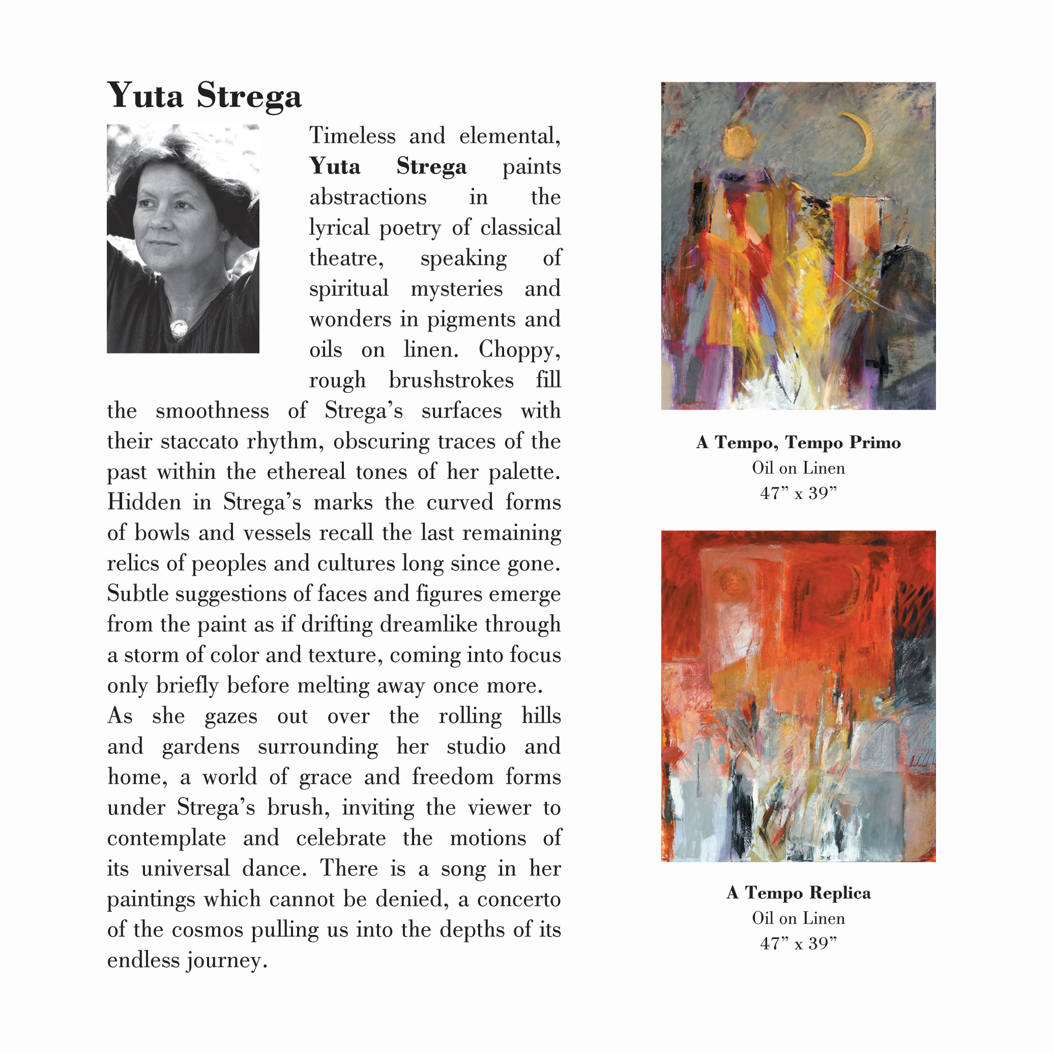 Faut-il encore parler après cela de sujets ? Pour la commodité, Yuta Strega titre ses œuvres : concerto, vision, bien sûr, mais aussi jarre, Okham, masque, anges déchus, Tenerezza, Japon, lumen, bol, toucher, l’habillement, etc. Mais en rester aux objets, aux lieux ainsi suggérés serait une erreur, car, on l’aura compris, tout tableau de l’artiste est une construction de pensées attachées à sa mémoire.